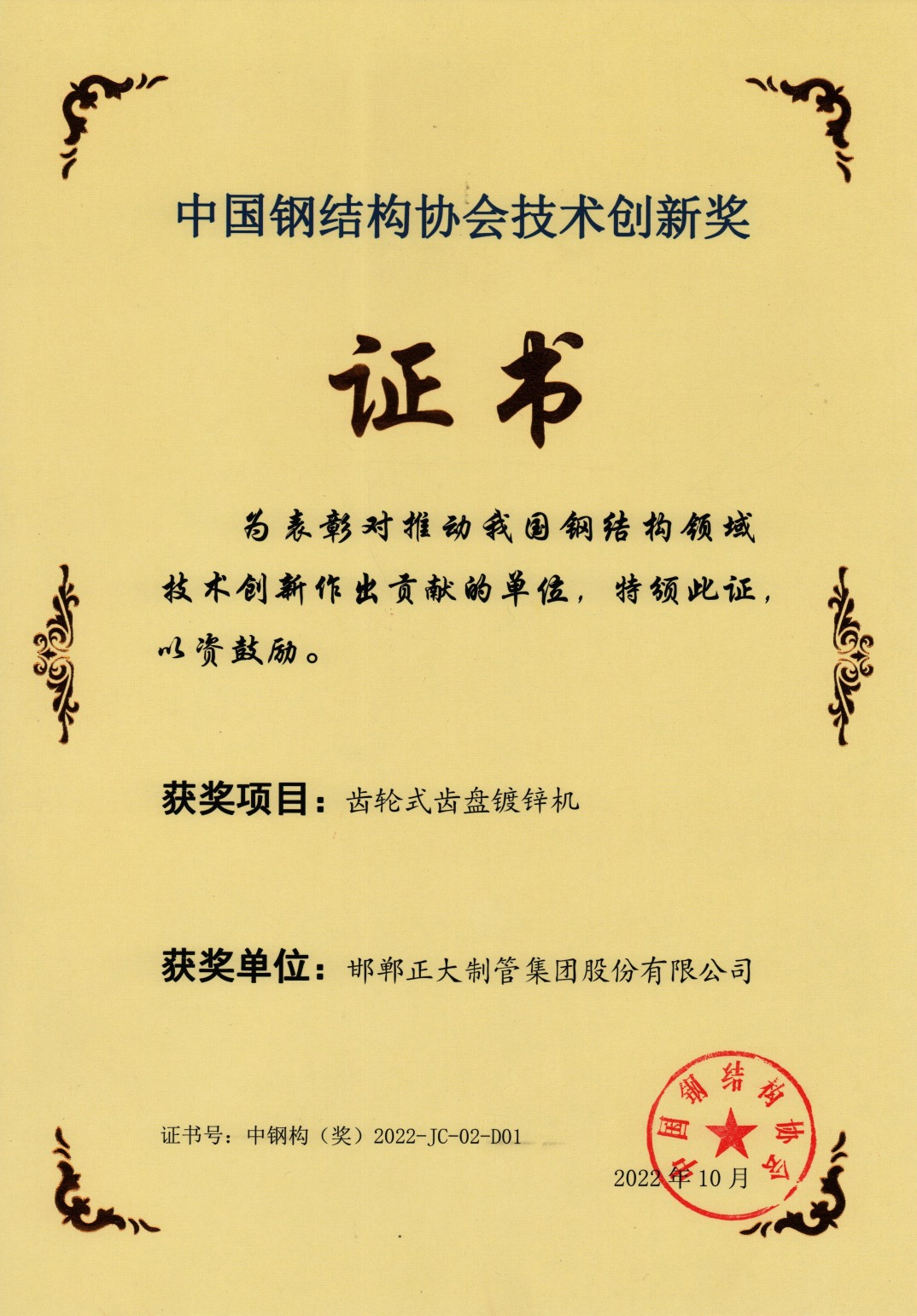 正大制管榮獲中國鋼結(jié)構(gòu)協(xié)會“技術(shù)創(chuàng)新獎”
